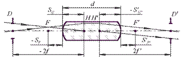 Дослідження, проведені в роботі [24], дозволили сформулювати основні закономірності при виборі конструктивних параметрів стрижнеподібних елементів, які зводяться до наступного: • із збільшенням різниці • із збільшенням показника заломлення середовища • із збільшенням • при підвищенні показників заломлення лінз аберації вищих порядків зменшуються. Використання стрижнеподібних лінз як колективи також вельми виправдане [25]. Головні площини стрижнеподібних компонентів розташовані на деякій віддалі один від одного, що дозволяє отримати оптичну систему з довжиною Для з'ясування впливу форми лінзи на величину відстані між головними площинами використовують відомі вирази для визначення її кардинальних елементів: