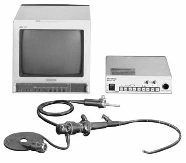 У відеокамерах високого класу застосовують три ПЗС-матриці. Це дозволяє отримати зображення високої якості з роздільною здатністю 550-870 телевізійних ліній. У трьохматричній системі кольорове зображення з ендоскопа поступає на кольороподільну призму, яка поділяє зображення на зелену, червону і синю складові. Вони проектуються на три роздільні ПЗС-матриці, кожна з яких формує свій сигнал. Ці камери громіздкі і дороги в порівнянні з одноматричними камерами, тому вони поки що не знайшли широкого поширення. Для створення відчуття об'ємного зображення призначена стереоскопічна ендовідеосистема (наприклад, OTV-S5 фірми OLYMPUS, рис. 2.19). Ця система складається із стереоендоскопа, поєднаною з ним стереовідеосистеми, електронного пристрою обробки відеосигналу, монітора і спеціальних окулярів. Надмініатюрна ПЗС-матриця, яка спільно з головним об'єктивом виконує роль мініатюрної відеокамери (наприклад, лапаро-тораковідеоскоп OES OLYMPUS LTF-V), може бути встановлена на дистальному кінці відеоендоскопа. Для подібних систем потрібний світловий волоконний джгут, але не потрібні джгут для передачі зображення і окуляр. У сучасних ендоскопічних приладах метод здобуття високоякісного зображення на моніторі дозволяє не лише розглядати збільшене зображення досліджуваного об'єкту, але і виконувати відеозапис, виведення окремих зображень на принтер.