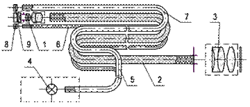 Рис. 4.15. Схема системи передачі зображення і світла в гастродуоденоскопі ГД-Б-ВО-3: 1 - об'єктив; 2 - гнучкий регулярний волоконний джгут (ГРЖВ) для передачі зображення; 3 - окуляр; 4 - джерело світла; 5 - джгут для передачі світла; 6, 7 - дистальні кінці джгута для передачі світла; 8, 9 - лінзи каналу передачі світла