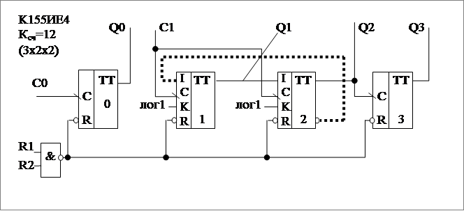 Такие счетчики чаще всего делают на коэффициенты пересчета, равные 10 или 6. Для их реализации обычно используют свойства входов D и IK отдельных триггеров, а не приведенные выше два способа реализации.