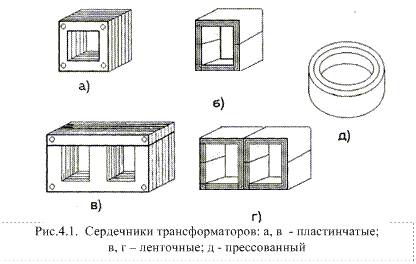 Трансформаторами называются электромагнитные устройства, имеющие две или большее число индуктивно-связанных обмоток и предназначенные для изменения величины (номинала) переменного напряжения (тока). В электротехнике и электронике получили распространение малогабаритные трансформаторы (МТ), мощность которых не превышает 4 кВ·А. Подавляющее большинство указанных трансформаторов – низкочастотные устройства. Трансформатор состоит из ферромагнитного магнитопровода (сердечника) и расположенных на нем обмоток. Магнитопроводы служат для обеспечения более полной связи между первичной и вторичной цепями и увеличения магнитного потока. Выбор материала магнитопровода зависит от назначения и свойств трансформатора. Применяют три типа магнитопроводов: стержневой, броневой и кольцевой. По конструкции броневые сердечники подразделяют на собранные из штампованных пластин и ленточные. Трансформаторы со стержневым магнитопроводом (из штампованных пластин, рис. 4.1 а, из двух половин ленточного кольца, рис. 4. 1 б) имеют неразветвленную магнитную цепь, на двух его стержнях располагают две катушки с обмотками. Такую конструкцию используют обычно для трансформаторов большой и средней мощности, так как наличие двух катушек увеличивает площадь теплоотдачи и улучшает тепловой режим обмоток. Трансформаторы с броневым сердечником (рис.4.1 в и г) имеют разветвленную магнитную цепь, обмотки в этом случае размещаются на одной катушке, располагаемой на центральном стержне магнитопровода. Такие магнитопроводы используют в маломощных трансформаторах.