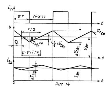 Рис. 13 Входной фильтр и выходной сглаживающий дроссель выбираются с таким расчетом, чтобы пульсации тока источника питания iвх и тока нагрузки iвых были незначительными, и поэтому ими можно пренебречь при приближенном определении пульсаций напряжения на конденсаторе входного фильтра Свх [3]. В таком случае можно считать, что в интервале времени γT, когда транзистор находится в открытом состоянии, конденсатор Свх разряжается током, равным разности выходного и входного токов, т.е.