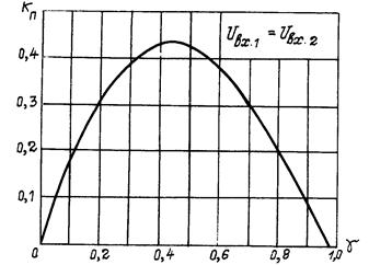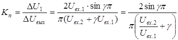 На рис. 16 построена рассчитанная по (17) зависимость коэффициента пульсаций от g для случая Uвх1 = Uвх2. Зависимость kn для схемы с неполной глубиной модуляции, как это видно из графика (см. рис. 16), характеризуется наличием экстремума при g, несколько меньшим значения 0,5 (при g = 0,5 амплитуда переменной составляющей имеет максимальное значение). При стремлении g к предельным значениям kn стремится к нулю. Диапазон регулирования выходного напряжения d можно оценить отношением