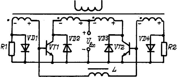 Включение нагрузки не вносит существенных изменений в работу схемы. Только рабочая точка транзистора после включения быстро переходит в положение 2 и затем в течение полупериода смещается до положения 3, а рабочая точка трансформатора после насыщения сердечника достигает только положения 5. Как видно из принципа действия схемы, трансформатор должен обладать прямоугольной формой кривой перемагничивания. Обратные диоды VD1 и VD2 нужны для обеспечения контуров протекания токов, вызываемых индуктивностями рассеяния обмоток трансформатора. Для обеспечения режима насыщения транзисторов номинальный ток базы Iб ном должен задаваться из условия