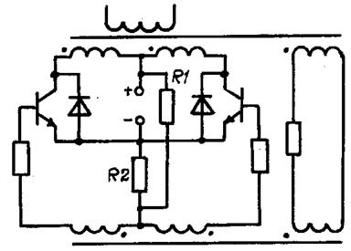Рис. 58 В момент подачи питающего напряжения через делитель Rl, R2 начинает протекать ток, падение напряжения на резисторе R2 от этого тока вызывает начальное отпирающее смещение на входах транзисторов, протекание начальных пусковых токов через базы транзисторов и соответствующе облегчение условий самовозбуждения автоколебаний, Более подробно вопросы устойчивого запуска автогенераторных преобразователей рассмотрены в [1].