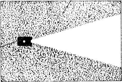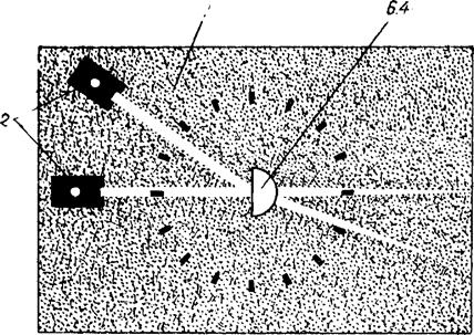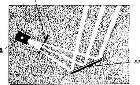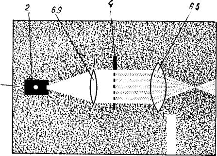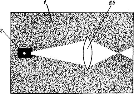 Рис. 3. Опыт 1. Источник света. Точечный источник света. На доске-экране 1 располагается осветитель 2. Подвижная шторка осветителя полностью закрыта. Отрывая шторку, обнаруживают на экране «след» расходящегося пучка света с меткими. неразмытыми границами (рис. 2). Пучок света исходит из светящейся точки — точечного источника света. Опыт 2. Распространение света в однородной среде. На пути расходящегося пучка света (рис. 3) устанавливают диафрагму 4. При прохождении через нее широкий пучок света разбивается на веер узких, которые в пределе следует рассматривать как модели лучей света. Видно, что эти узкие пучки-лучи исходят из одной светящейся точки - точечного источника света. Если расположить глаз на пути распространения пучка света, то он видит точку в том месте, откуда исходят лучи, т. е. в месте их пересечения, где на самом деле находится точка.