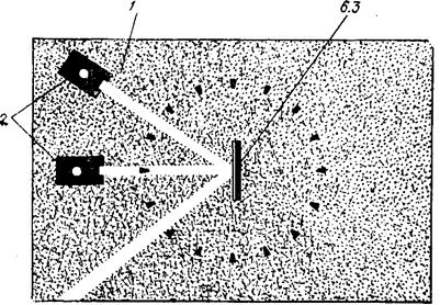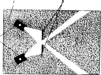 Рис. 4. Опыт 3. Образование тени. На пути распространения пучка света, исходящего из осветителя 2, располагается ширма 3, как показано на рисунке 4. На экране 1 отчетливо наблюдается область полной тени, образующаяся за непрозрачным телом при освещении его точечным источником света. Опыт 4. Образование тени и полутени. На доске-экране 1 располагаются два осветителя 2, моделирующие, крайние точки источника света протяженных размеров, и ширма 3 (рис. 5). На экране при этом кроме области тени обнаруживаются и области полутени — пространство между областями полной тени и полного света при освещении непрозрачного тела источником света больших угловых размеров.