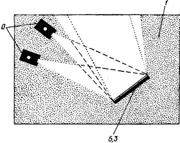 Рис. 9. плоскости экрана. Если под небольшим углом к плоскости экрана расположить лист белой бумаги (в той области, где наблюдается отраженный луч или луч-перпендикуляр), то на нем ни отраженный луч, ни «луч» перпендикуляр наблюдаться не будут. При установлении (проверке) второго закона отражения углы падения и отражения определяются по круговой шкале. Опыт 9. Изображение светящейся точки в плоском зеркале. Схема данного опыта такая же как и в опыте 7. Если расположить глаз в области отраженного пучка света, то глаз воспримет отраженные лучи как бы исходящими из некоторой точки, находящейся за зеркалом. Эта точка (мнимое изображение) находится там, где пересекаются продолженные за плоскость зеркала отраженные лучи. Из опыта становится понятным, что изо6ражение светящейся точки можно увидеть лишь, в том случае, когда глаз находится в области отраженного пучка света. Опыт 10. Изображение предмета в плоском зеркале. Пучки лучей света, исходящие из двух осветителей, направляются на плоское зеркало (рис. 10). Ход рассуждении – как и в случае предыдущего опыта Опыт иллюстрирует область видения изображения двух светящихся точек. Она представляет собой область пересечения отраженных пучков света.