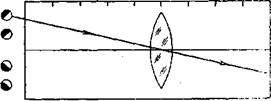 Рис. 12. Рис. 13. Устанавливая на экране по одной все линзы, проверить, совпадает ли оптический центр линзы с главной оптической осью прибора. 9. Опыты с прямоугольным экраном Опыт 1. Прохождение лучей через линзы. Поворачивая зеркала, получают пять параллельных лучей, Демонстрируемую линзу подвешивают на экране. Лучи, пройдя собирательную линзу, концентрируются в одной точке — в главном фокусе — или расходятся в случае рассеивающей линзы. Показывают явление сферической, аберрации и способ ее уменьшения поворотом крайних зеркал, убирая эти лучи с экрана; Направляя луч одним крайним зеркалам па линзу, получают наклоненный луч, которым демонстрируют побочную оптическую ось и свойства оптического центра линзы (рис. 14). Направляя на линзу лучи средними зеркалами, получают на главной оптической оси светящуюся точку. Лучи между зеркала-