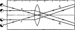 ми и точкой можно погасить, прикрыв это место экрана черной бумагой (на черной бумаге лучи не будут видны). Поместив линзу так, чтобы главный фокус совпадал со светящейся точкой, получают лучи, параллельные главной оптической оси (рис. 15).