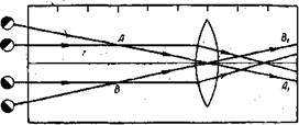 Рис. 19. Открывая среднюю щель, получают белый луч, изображающий главную оптическую ось линзы. Крайним верхним зеркалом направляют цветной луч-(например, красный) на оптический центр линзы — получают изображение побочной оптической оси. Вторым верхним зеркалом получают красный луч, параллельный главной оптической оси. Точка пересечения этих лучей до линзы будет служить светящейся точкой; А, лежащей на побочной оптической оси. Точка пересекший красных лучей после прохождения через линзу будет служить изображением светящейся точки А1. Так же поступают с нижними голубыми лучами. Получают голубую светящуюся точку В и ее изображение В1. Передвигая линзу вдоль экрана и устанавливая ее под различными указанными на рисунках отметками, можно демонстрировать ход, лучей при построении изображения предмета, находящегося на различных расстояниях от линзы (рис. 17, 18, 19, 20).
