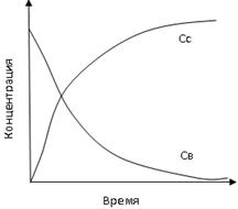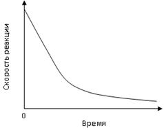 зависимость скорости реакции от концентрации реагирующих веществ При количественном рассмотрении скорость химической реакции принято характеризовать изменением концентрации реагирующих веществ в единицу времени. По существу безразлично, концентрацию какого из реагирующих веществ рассматривать. Концентрации исходных веществ будут уменьшаться, а получаемых — возрастать. Обычно скорость химической реакции при постоянных внешних условиях не остается постоянной, а изменяется во времени. Это изменение можно отобразить с помощью графической зависимости, приведенной на рисунке. Очевидно, что по мере расходования исходных веществ скорость протекания процесса уменьшается. В связи с этим численные значения скорости реакции будут различными в определенный промежуток или интервал времени.