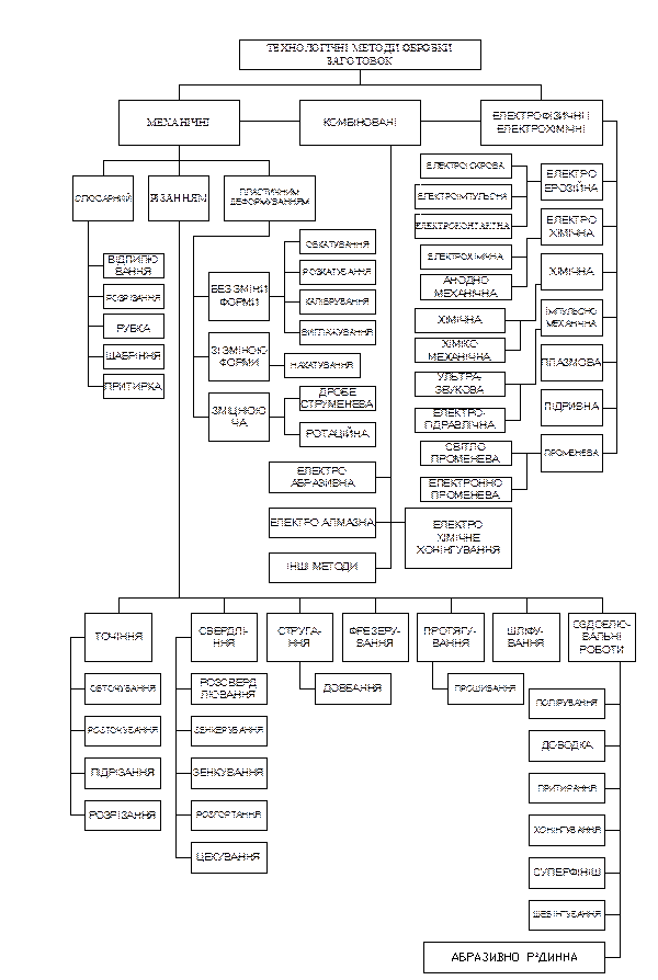 Машинобудування є найважливішою галуззю народного господарства, що визначає рівень і темпи розвитку всіх інших галузей промисловості, сільського господарства, енергетики, транспорту і т.д. Швидкий розвиток машинобудівного виробництва постійно вимагав наукового дозволу питань, пов'язаних з виготовленням машин, що привело до виникнення науки про технологію машинобудування. Технологія машинобудування – це наука про виготовлення машин, необхідної якості, у встановленому виробничою програмою кількості і в задані терміни, при найменших витратах живої і упредметненої праці, тобто при найменшій собівартості. В даний час для вирішення технологічних питань, в машинобудівній промисловості, розроблені теоретичні основи технології машинобудування, науково узагальнені і розвинені прогресивні методи обробки, типових поверхонь деталей машин, встановлені основні принципи проектування технологічних процесів виготовлення деталей і збірки машин, зокрема, в автоматизованому виробництві. У виробничих умовах виріб виготовляють по розроблених технологічних процесах, що включають певну сукупність і послідовність їх обробки. Метод обробки характеризується видом використовуваної енергії, способом дії інструменту на заготовку і схемою обробки певної поверхні заготовки. При обробці використовують наступні види енергії: · механічну - обробка металів різанням і тиском; · хімічну; · електричну; · світлопроменеву; · ультразвукову; · плазмову. За способом дії інструменту, на оброблювану заготовку, розрізняють: - вид контакта:- точковий, лінійний, просторовий; -і характер контакта:- безперервний, перервний, імпульсний і вібраційний. Класифікація технологічних методів обробки заготовок показана на рис.1. Слюсарна обробка- це надання деталі певної форми, шляхом зняття стружки, за допомогою елементарних, ручних або механічних інструментів. Наприклад: обпилювання, здійснюється за допомогою напилків, абразивних матеріалів (брусків, наждачного паперу і т.д.). Застосовується в одиничному і дрібносерійному виробництвах, на остаточних стадіях обробки. Розрізання – здійснюється ручними ножівковими пилами, пневмо-, електро-машинками із застосуванням відрізних кругів (болгарки). Застосовується, на складальних дільницях, на проміжних або початкових стадіях обробки. Рубка – здійснюється ручним інструментом (зубило і молоток) в одиничному виробництві, і механізованим інструментом (пневмомолоток) в серійному виробництві. Застосовується в загототівельних цехах, для очищення виливків від шлаку, окалини, приливів, ливарних стрижнів. Шабріння – здійснюється ручним інструментом – шабером (трьох- або чотиригранним). Застосовується на складальних операціях, для надання заготівці або деталі високої якості поверхні, тобто підвищення якості прилягання двох поверхонь. Наприклад: що направляють верстатів. Притирання – здійснюється вручну, за допомогою спеціальних притиральних порошків. Застосовується в одиничному виробництві, для досягнення рухомого з'єднання високої якості.