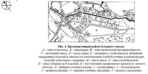 Ситуационным планом промышленного предприятия называют часть проекта, включающую в себя план определенного района населенного пункта или окружающей территории, на котором указывают расположение запроектированного предприятия и другие объекты, имеющие с ним непосредственные технологические, транспортные и инженерно-технические связи. Разрабатывая ситуационный план, стремятся территориально объединить предприятия в один промышленный узел, при этом руководствуются принципами концентрации и кооперации. Посредством концентрирования предприятий в одном месте может быть обеспечено совместное использование различных устройств и установок. Так, при кооперировании предприятий проблемы инженерного обеспечения и удаления отходов и стоков в промышленных районах решаются экономичнее, нежели для единичных предприятий, расположенных вне таких районов. Это относится к снабжению электроэнергией, газом, теплом, паром, горячей, питьевой и технической водой. Переработка одного и того же исходного сырья, производство одного и того же конечного продукта, совместная поставка продукции потребителям и, тем самым, рациональное использование транспортных средств или же кооперирование административных зданий, могут стать основанием для расположения и взаимосвязи различных предприятий в одном месте. Кооперирование предприятий в форме промышленных комплексов позволяет уменьшить размеры занимаемой площади. На рис. 4 показан ситуационный план промышленного района большого города. Можно отметить размещение предприятий с учетом производственных вредностей, удачное решение сети путей сообщения, использование теплоцентрали для всех предприятий, защитные полосы озеленения и «зеленый пояс».