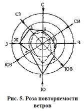 Ситуационный план разрабатывается в масштабе 1: 5000, 1: 10 000, 1: 25 000. В ситуационный план включают общие водозаборные сооружения, санитарно-защитные зоны, отмечаются точки выбросов газов и т.д. Для уменьшения загазованности жилого массива выбросами промышленных предприятий их располагают с учетом преобладающего направления ветров, которое определяют по средней розе ветров летнего периода на основе многолетних наблюдений (50…100 лет) метеорологических станций. Розу ветров располагают на ситуационных и генеральных планах в верхнем левом углу чертежа и строят в соответствующем масштабе следующим образом (рис. 5): окружность делят на восемь или 16 равных частей и в результате получают восемь или 16 румбов: С, СВ, В, ЮВ, Ю, ЮЗ, З, СЗ. От центра окружности (начало координат) откладывают в выбранном масштабе процентную повторяемость ветров в течение года (результат многолетних наблюдений) по соответствующим румбам. Полученные точки соединяют. Наиболее вытянутая сторона полученной фигуры показывает направление господствующих ветров. Для построения розы ветров по скорости откладывают силу ветра (в м/с) в выбранном масштабе по направлению соответствующих румбов и полученные точки соединяют между собой (на рис. 5 пунктир). Промышленные здания рекомендуется располагать продольной осью по направлению господствующего ветра или под углом 45° к нему. С использованием ситуационного плана разрабатывают генеральный план проектируемого предприятия в масштабе 1: 500, 1: 1000, 1: 200 или 1: 5000 (рис. 6), руководствуясь разделом СНиП «Генеральные планы промышленных предприятий». На генеральном плане промышленного предприятия изображают: размещение всех зданий и сооружений; расположение цехов по группам; ширину противопожарных и санитарных разрывов между зданиями; проезды и въезды в цехи, автодороги и железнодорожные пути; инженерные сети; ограждение территории с указанием въезда и проходных на территорию завода; размещение пожарных гидрантов, зоны озеленения, розу ветров. Основными критериями разработки генеральных планов являются: зонирование территории; разделение и изоляция грузовых и людских потоков; обеспечение компактности застройки; унификация и модульная координация элементов планировки (панелей, кварталов, проездов, проходов, коридоров, инженерных коммуникаций) и застройки территории; обеспечение возможности развития и расширения предприятия. При проектировании генерального плана предприятия следует находить наиболее экономичные и удобные производственные связи между отдельными цехами, сооружениями и устройствами, обеспечивающими основной производственный процесс, начиная от ввоза сырья до вывоза готовой продукции, включая утилизацию промышленных отходов. Зонирование начинают с объединения отдельных цехов, сооружений и устройств в группы в соответствии с определенными признаками с последующим распределением территории между этими группами. Зонирование осуществляют по производственному признаку, по степени грузоемкости цехов, по степени вредности производств, по пожаро- и взрывоопасности цехов.