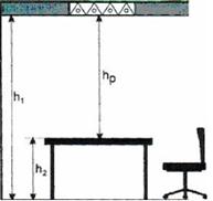 Рисунок 11.3 Расчёт высоты подвеса светильника над рабочей поверхностью. hp = h1 – h2 = 3,2 – 0,7 =2,5 м – высота подвеса светильника над рабочей поверхностью. Норма освещенности на рабочем месте – не менее 200 лк. Необходимое число светильников рассчитывается по формуле: