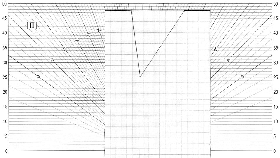 Накладываем макет помещения на график Данилюка и определяем n1 и n2: n1 = 13,9 n2 = 22,5 εб = 3,13 Кпр = 3,21 τ0 = τ1 * τ2 * τ3 * τ4 * τ5 – общий коэффициент светопропускания τ1= 0,8 – коэффициент светопропускания материала; τ2= 0,7 – коэффициент, учитывающий потери света в переплетах светопроема; τ3= 1 – коэффициент, учитывающий потери света в несущих конструкциях; τ4= 1 – коэффициент, учитывающий потери света в солнцезащитных устройствах; τ5= 0,9 – коэффициент, учитывающий потери света в защитной сетке, устанавливаемой под фонарями. τ0 = Кз= 1,2 – коэффициент запаса. Рис.1