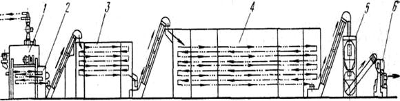 1 - шнековый пресс, 2 - виброподсушиватель, 3 - камера предварительной сушки, 4 - камера окончательной сушки; 5 - накопитель-стабилизатор, 6 - упаковочный автомат