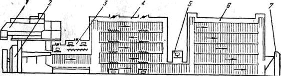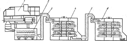 1 – пресс, 2 – камера для термообработки изделий, 3 и 5 – элеваторы, 4 – камера предварительной сушки, 6 – камера окончательной сушки