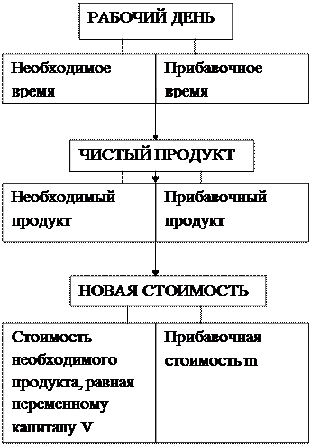 Рабочий день, если его рассматривать с точки зрения создания новой стоимости, делится на необходимое и прибавочное время. В течение необходимого времени наемный рабочий, создавая необходимый продукт, воспроизводит стоимость своей рабочей силы, или переменного капитала. Прибавочное время — часть рабочего дня, в течение которого создается прибавочный продукт, принимающий в условиях капитализма форму прибавочной стоимости. Рабочий день можно изобразить таким образом: