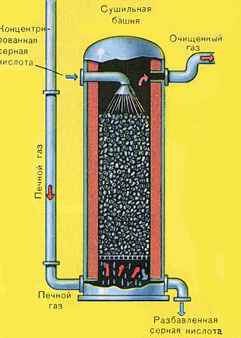 Осушку печного газа проводят в сушильной башне - снизу вверх поднимается печной газ, а сверху вниз льётся концентрированная серная кислота. На выходе из сушильной башни печной газ уже не содержит ни частичек огарка, ни паров воды. Печной газ теперь представляет собой смесь оксида серы SO2 и кислорода О2.