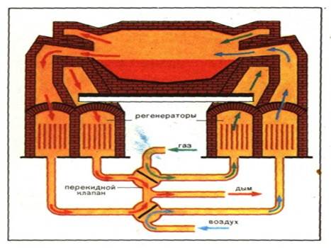 В плавильном пространстве печи сжигают газообразное топливо – смесь доменного газа с природным газом. Высокая температура обеспечивается газовыми регенераторами: через одну пару регенераторов подают газ и воздух, через другую пару выводят продукты горения. Газ с воздухом, соединившись в рабочем плавильном пространстве, создают газовое пламя (поэтому печь – пламенная), которое обеспечивает окислительный процесс. Регенерация – использование тепла газов для повторного нагрева.