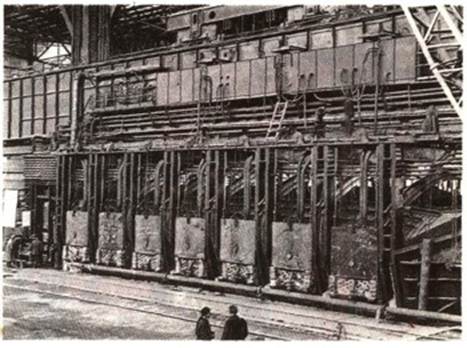 Недостатки процесса: · Большое пылеобразование из-за испарения железа. · Угар металла 6-9% Основные способы усовершенствования конвертера: 1. Продувка кислородом через днище – увеличивает интенсивность перемешивания металла, уменьшая потери Fe и Mn из-за угара. 2. Комбинированная подача кислорода сверху и через донные формы (кислород, азот, воздух, аргон). Способ Бессемера. По этому способу передел чугуна в сталь проводится путём продувания воздуха через расплавленный горячий чугун. Процесс протекает без затраты топлива за счёт тепла, выделяющегося при экзотермических реакциях окисления кремния, марганца и других элементов. Процесс проводится в аппарате, который называется по фамилии изобретателя конвертером Бессемера. Он представляет собой грушевидный стальной сосуд, футерованный внутри огнеупорным материалом. В дне конвертера имеются отверстия, через которые подаётся в аппарат воздух. Аппарат работает периодически. Повернув аппарат в горизонтальное положение, заливают чугун и подают воздух. Затем поворачивают аппарат в вертикальное положение. В начале процесса окисляются железо, кремний и марганец, затем углерод. Образующаяся окись углерода сгорает над конвертером ослепительно ярким пламенем длиной до 8 л. Пламя постепенно сменяется бурым дымом. Начинается горение железа. Это указывает, что период интенсивного окисления углерода заканчивается. Тогда подачу воздуха прекращают, переводят конвертер в горизонтальное положение и вносят раскислители. Процесс Бессемера обладает рядом достоинств. Он протекает очень быстро (в течение 15 минут), поэтому производительность аппарата велика. Для проведения процесса не требуется расходовать топливо или электрическую энергию. Но недостаток в том, что этим способом можно переделывать в сталь не все, а только отдельные сорта чугуна. К тому же значительное количество железа в бессемеровском процессе окисляется и теряется (велик «угар» железа). Значительным усовершенствованием в производстве стали в конвертерах Бессемера является применение для продувки вместо воздуха смеси его с чистым кислородом («обогащённого воздуха»), что позволяет получать стали более высокого качества. Мартеновский способ Используется с 1865 г. (изобретен французским металлургом Мартеном) Мартеновская печь по принципу является пламенной и регенеративной печью.