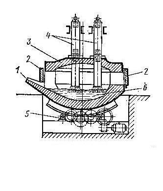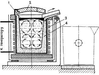 Корпус печи имеет форму цилиндра со сферическим или плоским днищем. Снаружи стальной кожух, внутри – огнеупорные материалы. В стенке печи – рабочее окно для слива шлака, загрузки ферросплавов, взятие проб. Съемный свод имеет отверстие для электродов. Готовую сталь выпускают через выпускное отверстие со сливным желобом. Рядом с печью помещены механизмы для подъема электродов и понижающий трансформатор питающий печь энергией. Угольные или графитизированные электроды в процессе плавки постепенно сгорают и их наращивают снова, свинчивая с новыми электродами. Этапы процесса: 1. Загрузка через окно шихты (иногда через свод)→загружается известь и железная руда. 2. Электроды опускаются к поверхности шихты и подают эл. ток через трансформатор. 3. через 10-15 минут скачивают 60-70% шлака (в нем большая часть фосфора) 4. Добавляется флюс - известь 5. Повышение температуры →окисление углерода→кипение Когда проба покажет, что содержание углерода достаточно необходимого значения начинается “ восстановительный ” период плавки (Снижение процента серы, доведение состава металла до заданного. Фосфор окисляется в фосфорный ангидрид, который образует с окислами металлов соединения, растворимые в шлаке. Но содержание серы снижается незначительно, и поэтому важно чтобы в исходных материалах было мало серы.) Недостатки процесса · Угар при плавке. · Невозможно выплавлять низкоуглеродистые стали. Индукционная тигельная печь