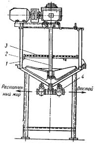 Для растапливания жира (маргарин, сливочное масло) применяются жирорастопители различной конструкции, выполняемые в виде бачков цилиндрической формы, имеющие водяную рубашку. Для сокращения времени растапливания жира внутри бачка дополнительно устанавливается пропеллерная мешалка. Наиболее широко применяемый на хлебопекарных предприятиях жирорастопитель Х–15Д (рис. 4) состоит из бачка с коническим днищем и рубашкой, через которую пропускается горячая вода. Внутри бачка установлен вертикальный вал с конусным пропеллером, вращающийся с частотой 48 об/мин. Вал приводится во вращение от электродвигателя. Для растапливания жир загружается в бачок на металлическую решетку, после чего включается электродвигатель, а через рубашку пропускается горячая вода. Растопленный жир выпускается из бачка через тройник и пробковый кран. Во избежание расслаивания жира мешалка не включается до полного выпуска из бачка растопленного жира.