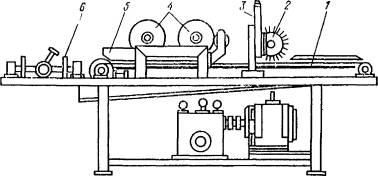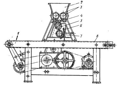 Рис. 18. Машина МПС–2 для формования сухарных плит: 1 – станина; 2 – приемная воронка; 3 – рифленые палки; 4 – матрица; 5 – отсекатель; 6 – фартук; 7 – барабан для закатки долек; 8 – ленточный транспортер