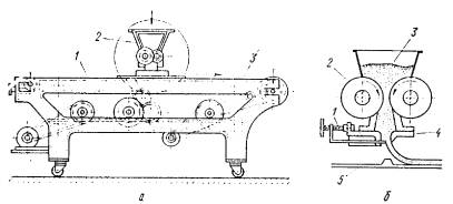 Рис. 19. Машина ФПЛ–2 для формования сухарных плит: а – общий вид; 1 – станина; 2 – приемная воронка; 3 – ленточный транспорте; б – узел выпрессовывания теста; 1 – регулировочный винт;