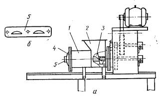 Рис. 20. Машина для формования сухарных плит конструкции А. Т. Соболева: а – общий вид; б – матрица; 1 – корпус; 2 – приемная воронка; 3 – шнек; 4 – конусная крышка; 5 – матрица