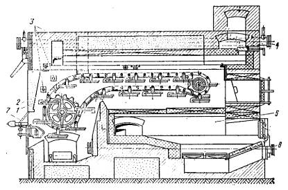 Рис. 26. Хлебопекарная конвейерная печь ФТЛ–2: 1 – топки; 2 – пекарная камера; 3 – цепной конвейер; 4 – люлька; 5 – блок;