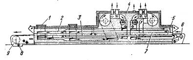 Рис. 28. Хлебопекарная конвейерная печь ВНИИХП–П–157: 1 – пекарная камера; 2 – цепной конвейер; 3 – трубки увлажнения;