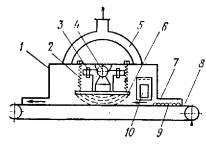Рис. 30. Схема опытно–промышленной ВЧ–установки для выдержки сухарных плит: 1 – корпус; 2 – шпильки; 3 – подстрочная индуктивность; 4 – фидерная труба;