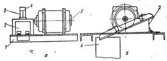 Рис. 35. Машина для продольной резки сухарных плит конструкции И. Д. Сенюшкина; а – общий вид; б – вид сбоку; 1 – станина; 2 – наклонный лоток; 3 – дисковый нож;