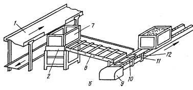Картонные коробки в красочном исполнении применяются для фасовки сухарей Любительские, Ванильные, Сливочные. Помимо названия изделий на боковых сторонах и донышке коробки помещен реквизит: наименование предприятия и его адрес, масса нетто, дата выпуска продукции и номер стандарта. Сухари могут завертываться в пачку, сверху которой наклеивается этикетка с обозначением наименования предприятия, изделия и розничной цены. Фасовка сдобных сухарей в полиэтиленовые пакеты производится на специализированных автоматах, описание которых приведено ниже. В ящик с весовыми или фасованными в потребительскую тару сухарями вкладывается ярлык с указанием номера или фамилии укладчика. Кроме того, на одной из сторон ящика должна быть сделана маркировка с указанием: наименования организации, в систему которой входит предприятие, наименования предприятия и его адрес, наименования сухарей, массы (нетто, брутто) сухарей, даты и смены выпуска продукции и номера стандарта. На крышке ящика делается надпись крупным шрифтом «Не бросать», чтобы предупредить ломку сухарей при погрузочно-разгрузочных работах и транспортировке, Маркировку ящиков допускается заменять наклейкой этикеток, отпечатанных типографским способом. ЛО ВНИИХПа проведена работа по НОТ на ряде предприятий г. Ленинграда, вырабатывающих сдобные сухари. На участке упаковки сухарей были рекомендованы следующая компоновка рабочих мест и необходимый для этого инвентарь (рис. 69). Подача сухарей из производственного отделения к рабочим местам производится ленточным транспортером. Рабочие места располагаются вдоль транспортера с одной пли двух сторон. На рабочем месте предусмотрены площадка с платформенными весами и полкой для этикеток и бумаги, поддоны для установки ящиков и ящик для брака. Взвешенные с продукцией ящики устанавливаются на поддон, который вилочным погрузчиком направляется на склад. На некоторых предприятиях вместо поддонов используются цепные транспортеры с рольганговым скатом (см. рис. 69, б), по которому ящики с продукцией поступают на склад. На участке фасовки сухарей рекомендована' другая компоновка и инвентарь рабочего места укладчиц (см. рис. 69, а). Для приемки сухарей из производства предусмотрен стол па два, три и более рабочих мест, расположенных вдоль транспортера с одной или двух его сторон.