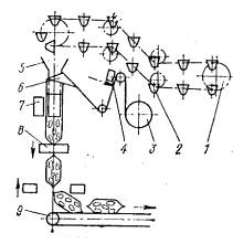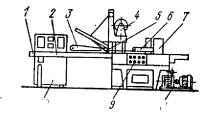 Рис. 70. Упаковочная машина Филутекс 8И: 1 – станина; 2 – транспортер подачи изделий на упаковку; 3, 6 – прижимные транспортеры;