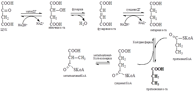 ЩУК в результате трех последовательных ферментетивных реакций превращается в янтарную кислоту, реакции протекают с участием НАДН+, возникших при окислении 3-ФГА. На сукцинат переносится КоА-группа с пропионил-КоА, в результате чего образуются сукцинил-КоА и пропионовая кислота, которая выводится из процесса и накапливается вне клетки. Сукцинил-КоА с помощью изомеразы превращается в метилмалонил-КоА. Эту реакцию называют ключевой в пропионовом брожении, т.к. в ней подготавливается субстрат, являющийся предшественником пропионовой кислоты, - метилмалонил-КоА.