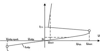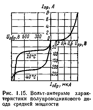 Для точечного диода ВАХ при различных температурах приведены на рис 1.13. Из-за малой площади контакта прямой ток таких диодов сравнительно невелик. По той же причине у них мала и межэлектродная емкость, что позволяет применять эти диоды в области очень высоких частот (СВЧ-диоды). Точечные диоды используют в основном для выпрямления. Для плоскостного выпрямительного диода ВАХ на рисунке 1.15. При подаче на полупроводниковый диод обратного напряжения в нем возникает незначительный обратный ток, обусловленный движением неосновных носителей заряда через р-n-переход. Основными параметрами выпрямительных диодов являются: 1.прямое напряжение Uпр, которое нормируется при определенном прямом токе Iпр; 2.максимально допустимый прямой ток диода Iпр мах. 3.максимально допустимое обратное напряжение диода Uобр мах; 4.обратный ток диода Iобр, который нормируется при определенном обратном напряжении Uобр.