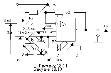 При отклонении от резонансной частоты f0 фазовый сдвиг изменяется, и коэффициент передачи уменьшается. Ниже частоты f0 проявляется действие возрастающего сопротивления конденсатора, включенного последовательно с R. Выше частоты f0 проявляется шунтирующее действие конденсатора, включенного параллельно R. Такой фильтр можно использовать в качестве нагрузки вместо LC-контура (но его добротность мала, что приводит к малой стабильности рабочей частоты). Гораздо большую добротность можно получить, если использовать полосовой заграждающий фильтр - мост Вина (рисунок 18.10). Сопротивления R1 и R2 моста находятся в соотношении R1=2R2. Напряжение Uмд снимается с диагонали моста, учитывая, что R1=2R2, независимо от частоты сигнала на входе. Uм2=Uм/3, поскольку на частоте f0 Uм1=Uм/3. Следовательно, на данной частоте Uмд=Uм1-Uм2=0. При отклонениях от f0 выходное напряжение растет и при больших расстройках стремится к Uмд=-Uм2=-Uм/3. В качестве активных элементов используются ОУ (рисунок 18.11). Диагональ моста подключается к входу ОУ. Для генерации обеспечивается ПОС на частоте f0, но если R2=R1/2, то на частоте f0 Uд=0 и обратная связь отсутствует. По этой причине мост немного расстраивают, выбирая R2=R1/(2+δ), где 0<δ≈1. В этом случае на резонансной частоте: Uмд=Uм1-Uм2=Uм/3-Uм/(3+δ)≈δUм/9, то есть напряжение, подаваемое на неинвертирующий вход, больше, чем напряжение, подаваемое на инвертирующий вход. Uос на входе совпадает по фазе с напряжением на выходе генератора (моста Вина). Таким образом, выполняется