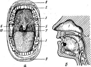 Рис. 1. Речевой аппарат: а — полость рта (вид спереди)[1]; 1 — язык; 2 — зубы; 3 — мягкое нёбо; 4 — маленький язычок; 5 — передняя дужка; 6 —задняя дужка; 7 — миндалина; 8 — верхняя губа; 9 — нижняя губа; 10 — полость глотки (видна ее задняя стенка) б—полость рта и носа (разрез сбоку); 1 — полость носа; 2 — твердое нёбо; 3 — мягкое нёбо; 4 — язычок; 5 — кончик языка; 6 — передняя часть спинки языка; 7 – средняя часть языка; 8 — задняя часть языка; 9 — корень языка; 10 — носоглотка; 11—зев; 12 — глотка; 13 — надгортанник; 14 — пищевод; 15 — гортань.