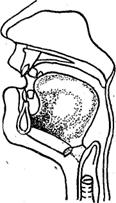 ПРИ ОБРАЗОВАНИИ ГЛАСНЫХ ЗВУКОВ [2] Звук А. Нижняя челюсть опущена, расстояние между зубами равно двум пальцам, язык лежит плоско, кончик языка у нижних передних зубов, губы образуют ровный овал, нёбная занавеска поднята, голосовые связки вибрируют. Звук О. Челюсть опущена на расстояние меньшее, чем при А (на полтора пальца), губы несколько вытянуты вперед и округлены, кончик языка опущен вниз и оттянут от нижних передних зубов, задняя часть языка несколько приподнята к мягкому нёбу. Звук У. Челюсть опущена на расстояние, равное одному мизинцу, губы сильно выдвинуты вперед и округлены больше, чем при звуке О; кончик языка отодвинут от нижних передних зубов на расстояние большее, чем при звуке О, задняя его часть высоко поднята к нёбу, нёбная занавеска поднята, голосовые связки вибрируют.