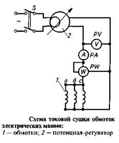 Если обмотка электродвигателя сильно увлажнена и сопротивление изоляции после сушки остается ниже нормы, следует провести циклическую сушку. В этом случае процесс сушки складывается из периодических нагреваний и охлаждений обмотки. При охлаждении обмотки влага переходит от более нагретых внутренних участков к поверхности, и процесс сушки ускоряется.