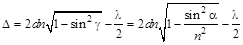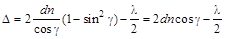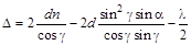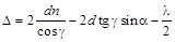 Оптическая разность хода лучей 1 и 23, достигших волновой поверхности DC, описывается выражением D = (АВ + ВС) n – (АD + l/2), где (AB + BC) n — оптическая длина пути луча 2, (АD + l/2) — оптическая длина пути луча 1 (здесь слагаемое l/2 учитывает потерю 1-м лучом полуволны при отражении его от оптически более плотной среды — пленки). (AB + BC) = 2 AB; из D AFB: Из D AЕB: AE = EB tgg, но EB = d, поэтому AE = d tgg и AС = 2 AE = 2 d tgg. Наконец, AD = AС cos(90° – a) = 2 d tggsina. Таким образом,