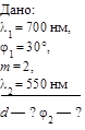 Если волна падает перпендикулярно поверхности пленки, то sina = 0 и Пример 3. Белый свет падает на дифракционную решетку перпендикулярно к ее поверхности. Чему равен период решетки d, если для того, чтобы увидеть красную линию (l1 = 700 нм) в спектре второго порядка, зрительную трубу необходимо установить под углом j1 = 30° к нормали к решетке? Определите положение максимума второго порядка