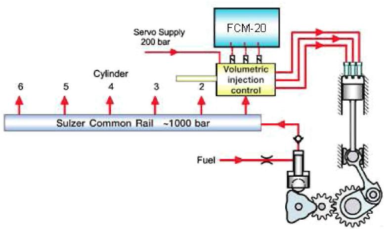 Компьютеризированная система управления двигателем WECS была специально разработана для двухтактных двигателей Sulzer Она, контролирует следующие функции: - Запуск, остановка и задний ход; - Впрыска (включая VIT) и выхлопные фазы газораспределения; - Топливную рейку; - Давления масла для управления выпускыми клапанами; - Резервирование и контрольные функции Все параметры, которые контролирует систем, делятся на две группы, параметиры пользователя и заданные параметры завода изготовителя, которые защещины паролем. WECS-9500 - это центральная система управления двигателем. Она обрабатывает все запуски, регулирования и непосредственно осуществляет контроль элементов, зависящих от двигателя: 1. Мониторинг общей аккумуляторной топливной магистрали высокого давления и регулирования давления; 2. Управление и мониторинг выпускного, инжекционного и пускового клапанов; 3. Интерфейс внешних сигналов через шины САNbus или MODbus; 4. Улучшение характеристик двигателя, установка и мониторинг IMO (Международная морская организация); WECS-9500 не имеет центрального компьютера, но каждый цилиндр имеет свой собственный модуль ГМК-20 и общие функции. Эти модули ГМК-20 непосредственно устанавливаются на двигатель и связываются через внутреннюю систему САNbus. Доступ оператора к WECS-9500 встроенный в интерфейс пользователя для системы управления и flexView. WECS-9500 не является дистанционной системой управления двигателем, не его системой безопасности. Система дистанционного управления. Дистанцийне управления - это интерфейс оператора к двигателю. Выборочные коммутационные панели поставляют следующие команды маневрирования доWECS-9500 через связь САNbus или MODbus: 1. Пусковое, тормозное воздуха; 2. Остановка; 3. Вперед; 4. Назад; 5. Поток воздуха; 6. Медленное движение; 7. Переустановка при сбое на короткие обороты. Дистанционное управление обрабатывает машинные телеграфные команды с внутренними настройками в сигналы индикации скорости для системы регулирования. Электронная система регулирования посылает топливные команды для WECS-9500 и регулирует скорость двигателя. Топливная команда подсчитывается от сигналов скорости полученных от системы дистанционного управления по отношению к нагрузке двигателя. Ограничитель поставки топлива в системе регулирования ограничивает команду топлива в зависимости от действительной скорости и давления воздуха в цилиндре с целью предотвращения работы двигателя за пределами кривой пропеллера. Система безопасности активирует отключение в случае чрезмерной скорости и других необычных условий работы двигателя и вспомогательного оборудования. Функция двигателя RT-Flex аналогичная традиционным двигателям RTA, но имеет некоторые отличительные дополнительные функции WECS-9500 использует резервную коммуникацию BUS с системой безопасности: 1. Система безопасности непосредственно активирует подключен проводами соленоид аварийной остановки для разгерметизации общей аккумуляторной топливной магистрали высокого давления. Дополнительно система безопасности поставляет цифровые выходные сведения в WECS-9500 через САNbus: 2. При опрокидуванни главного подшипника и утечке масла сигналы отключения для запуска и защиты сухой работы насосов масла контура управления; 3. Сигнал остановки до WECS-9500 для активации исключения внутренних характеристик WECS; 3. Невозможнос