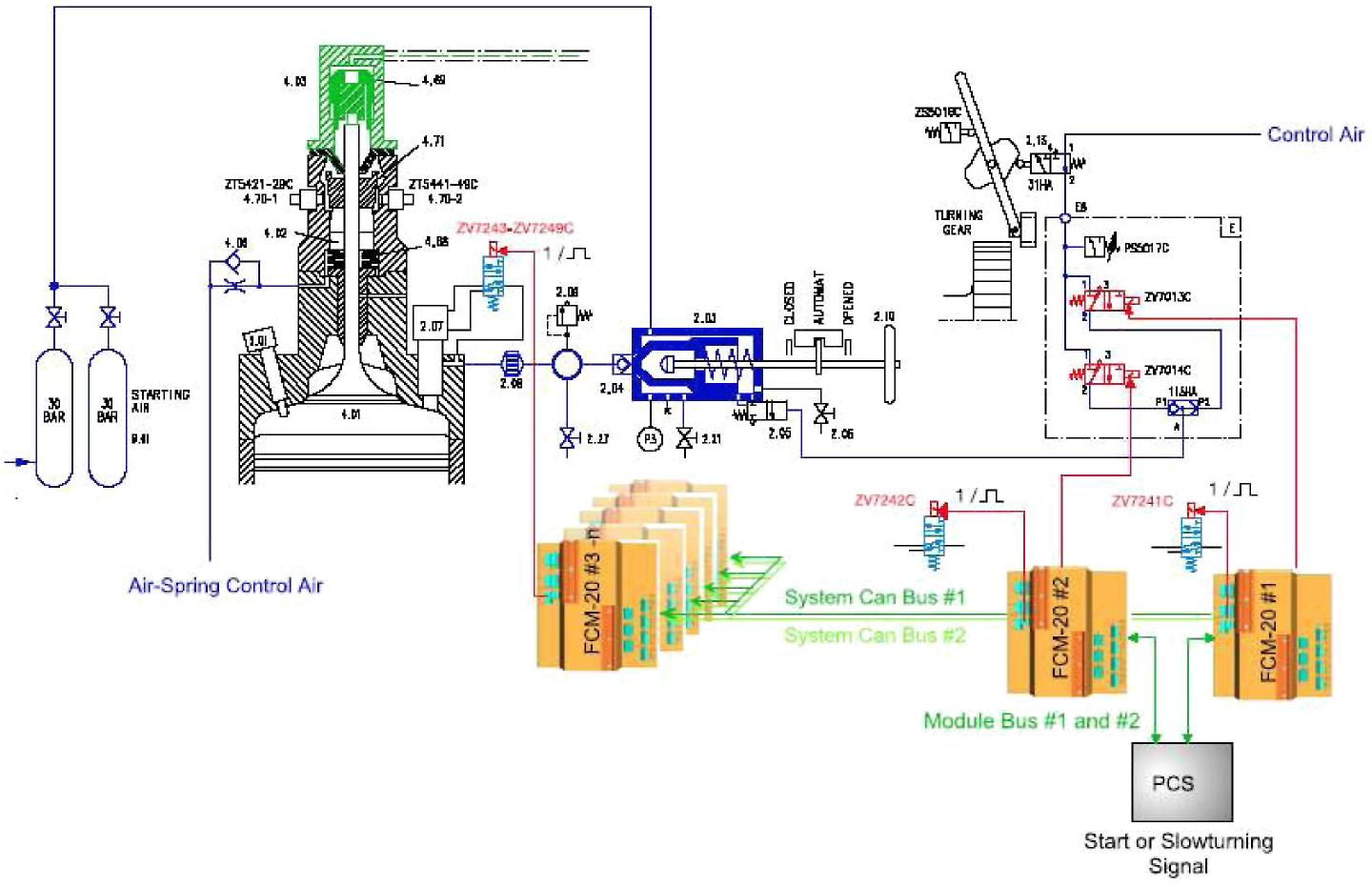 Для медленного вращения и для переустановки медленного вращения пульт дистанционного управления посылает отдельные сигналы к ГМК-20 # 1 и ГМК-20 # 2. Скорость медленного вращения может регулироваться в параметрах WECS-9500 при адаптации циклов пульсации. Дополнительно, сигнал Поставка Воздух дает возможность продуть двигатель пусковым воздухом. Принцип работы. Пространство 'AL' заряжается давлением пускового воздуха. Пространство "P3" заряжается через отверстия 'EB' и таким образом помогает пружине 5 в закрытии клапана. Подключение "SL" под давлением системы труб пускового воздуха. Через клапан 8 пространство "P2" в трубу 4 подключается с поставкой "SL". Пусковой клапан закрывается. 5/2 клапан с электромагнитным управления 8 контролируется модулем управления цилиндра.