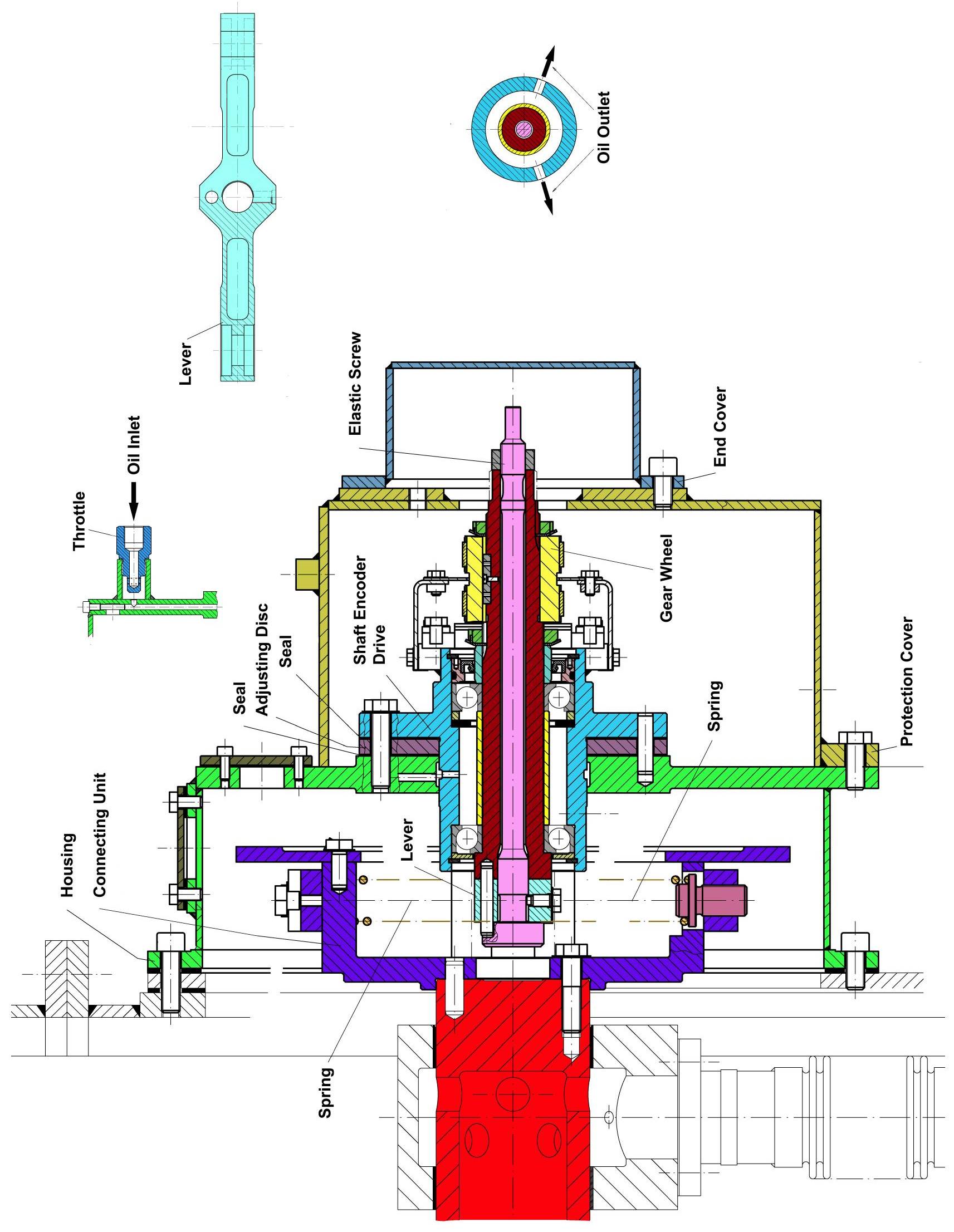 Рисунок 2.27 - пусковой клапан: 1-крышка 2 - Кольцо, 3 - Поршень, 4 - Кожух, 5 - Компрессионная пружина 6 - Шток клапана, 7 - Крышка цилиндра, 8 - 5/2-клапан с электромагнитным управлением, AL - Пусковое воздуха, EB - С ' Соединительный отверстие, P1-P3 - Воздушное пространство, SL - Подключение рабочего воздуха от системы труб пускового воздуха Датчики угла поворота коленчатого вала. Без прямой механической трансмиссии углу поворота коленчатого вала до контрольных элементов для впрыска топлива и выпускных клапанов необходимо измерять действительный угол поворота коленчатого вала электрическим путем. Датчики угла поворота коленчатого вала для WECS-9500 имеют абсолютную точность углу, поэтому точная величина угла поворота коленчатого вала предоставляется мгновенно после поставки питания (без необходимости запуска угловых датчиков до момента появления свободного выхода). Два таких угловых датчики подключаются при помощи зубчатых ремней в специальный вала двигателя. Такое использование предотвращает трансмиссии аксиальных и радиальных перемещений коленчатого вала до датчиков. В конце один из датчиков должен работать. Если один не работает, WECS-9500 может обнаружить неполадку, работа будет продолжаться с сигналом безопасности (проверка вероятности). В случае повреждения обоих датчиков, двигатель остановится без задержки. Работа в экстренных случаях невозможна без как минимум одного датчика угла поворота коленчатого вала! Они отделены от коленчатого вала специальным сцеплением. Они создают точный цифровой сигнал действительного положения коленчатого вала (0.... 360 °). Датчик угла поворота коленчатого вала имеет резолюцию 0.1 Пружинная муфта амортизирует все вертикальное и горизонтальное перемещение коленчатого вала. Она активирует вал поддерживается двумя шариковых подшипников. Подшипники смазываются смазкой на масляной основе. От вала зубчатый ремень активирует каждый датчик. Каждый датчик трансформирует данные углу от оптического кодирующего диска в битовую конструкцию. Модули ГМК считывают эти битовые конструкции от шины SSI (Синхронная серийная шина интерфейса). Датчики угла поворота (рисунок 2.28) коленчатого вала (или кодирующий датчик положения вала) поставляют сведения и импульсы синхронизации в контрольных модулей цилиндра (КМЦ) через коммуникационную шину SSI. Сигналы от двух датчиков угла поворота коленчатого вала проверяют ошибки с помощью КМЦ. Каждый КМЦ сам по себе выбирает один из датчиков как точного измерителя сигнала коленчатого вала. Этот сигнал используется для определения угла поворота коленчатого вала, скорости двигателя, определения направления вращения двигателя, а также для обработки сигнала ВМТ. КМЦ1 или КМЦ2 избираются как точный измеритель такта CYL-EU, а также для снабжения тактового пульса для синхронизации кодирующего устройства и других КМЦ. Вал двигателя и ремни к датчикам угла поворота коленчатого вала контролируется с целью выявления сползания. Сигналы углА поворота коленчатого вала сравниваются с пульсовым сигналом ВМТ (верхняя мертвая точка) для блока цилиндра # 1 для подбора махового колеса. Пульс ВМТ поставляется в КМЦ # 1, который осуществляет проверку ли этот пульс сигнала углу поворота коленчатого вала. Если эта разница очень большая, подается сигнал тревоги или отключения WECS-9500 (в зависимости от уг