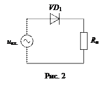Задание. На вход диодного преобразователя поступает синусоидальное напряжение частотой f = 50 Гц с амплитудным значением U вх.m. Для заданной схемы преобразователя напряжения (рис. 1) подобрать по справочнику полупроводниковые диоды, построить временные диаграммы напряжения на диодах и на нагрузке, а также тока, протекающего через диоды и нагрузку. Рассчитать амплитудные значения напряжения U нm и тока нагрузки I нm. Предельные, статические и динамические параметры диодов указаны в справочниках [2, 3]. В табл. 1 приведены основные параметры выпрямительных диодов. Варианты заданий в виде значений входного напряжения u вх. и сопротивления нагрузки R н приведены в табл. 2.